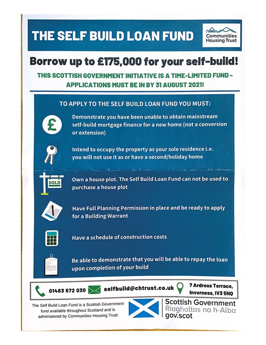 On behalf of The Scottish Government, Communities Housing Trust are administering this time limited fund to assist self-builders where they are unable to obtain mainstream finance. Eligible individuals can borrow up to £175,000 which they can draw down in staged payments similar to a traditional self-build mortgage - the flyer below provides further details on the fund. Details and eligibilty criteria in relation to the SBLF can be found at https://www.chtrust.co.uk/scotland-self-build-loan-fund.html